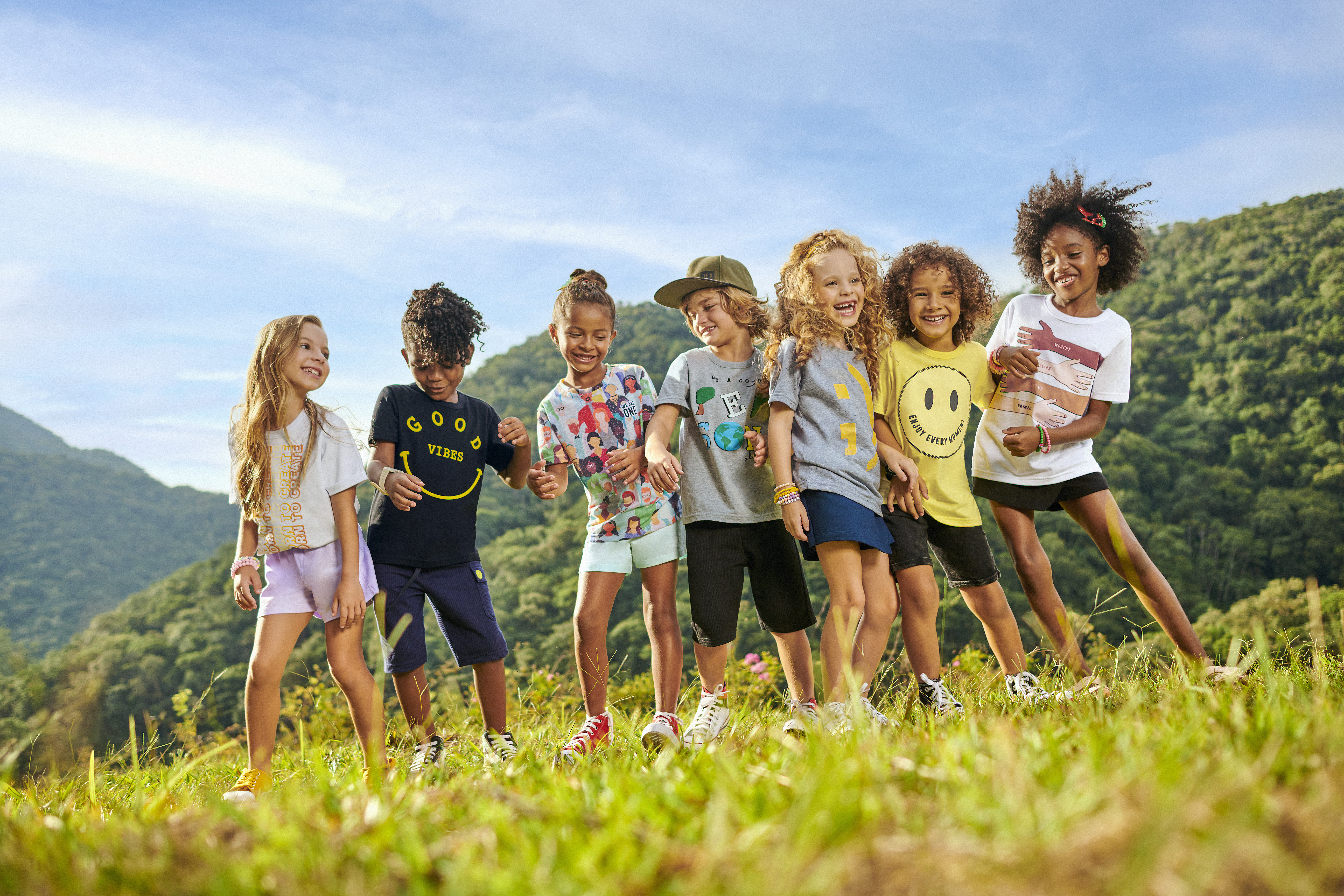Positive Vibes: composta por peças produzidas com malha reviva (feita de fio reciclado de garrafa PET) que falam do empoderamento, do cuidado e do amplo respeito a todos com mensagens positivas. As camisetas são para meninos e para meninas, com estampas superdivertidas e inclusivas.