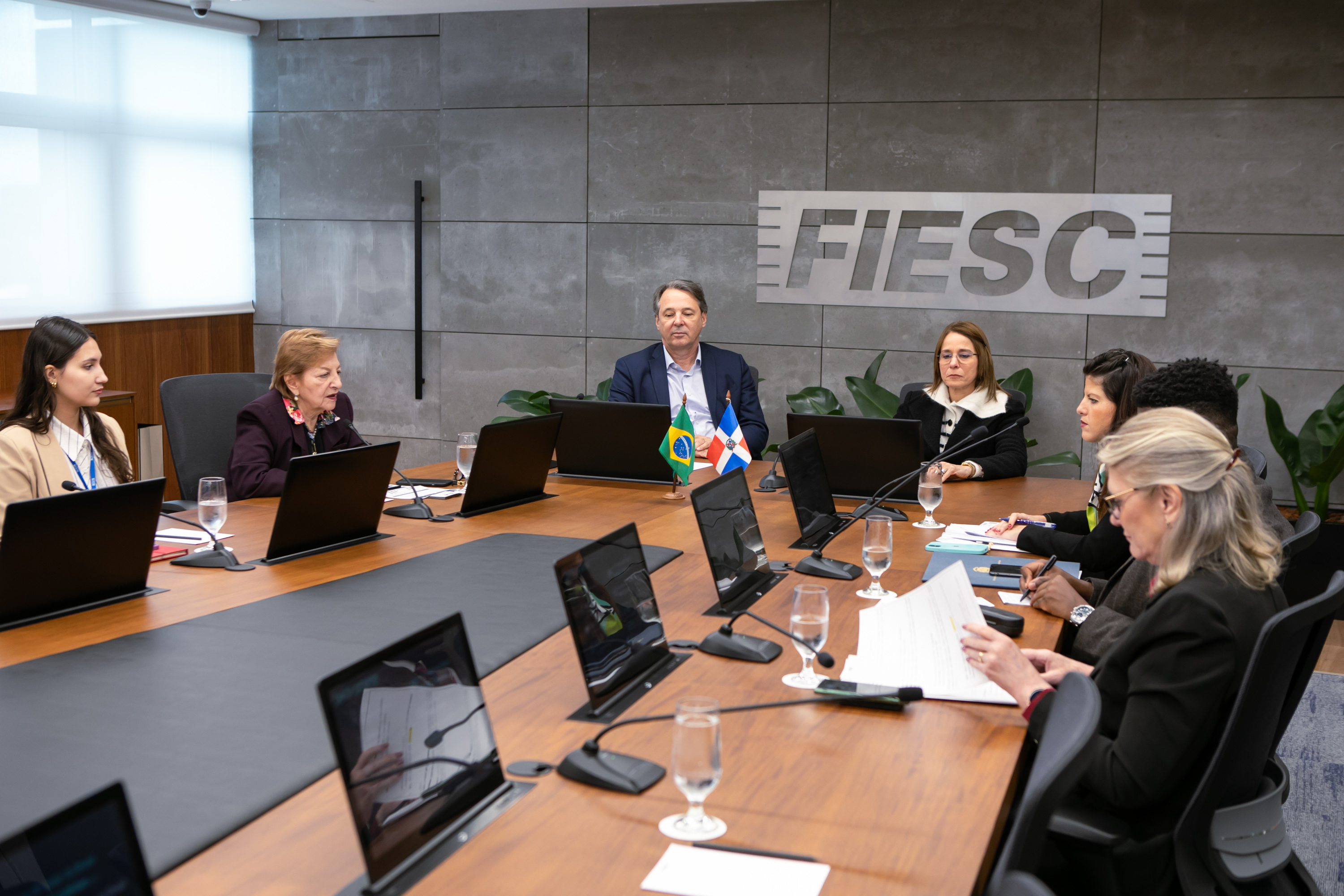Florianópolis, 05.07.24 - O diretor institucional e jurídico da Federação das Indústrias de Santa Catarina (FIESC), Carlos José Kurtz, e a presidente da Câmara de Comércio Exterior da entidade, Maria Teresa Bustamante, receberam nesta sexta-feira, 5, a comitiva da República Dominicana, liderada pela embaixadora Patricia Villegas de Jorge.