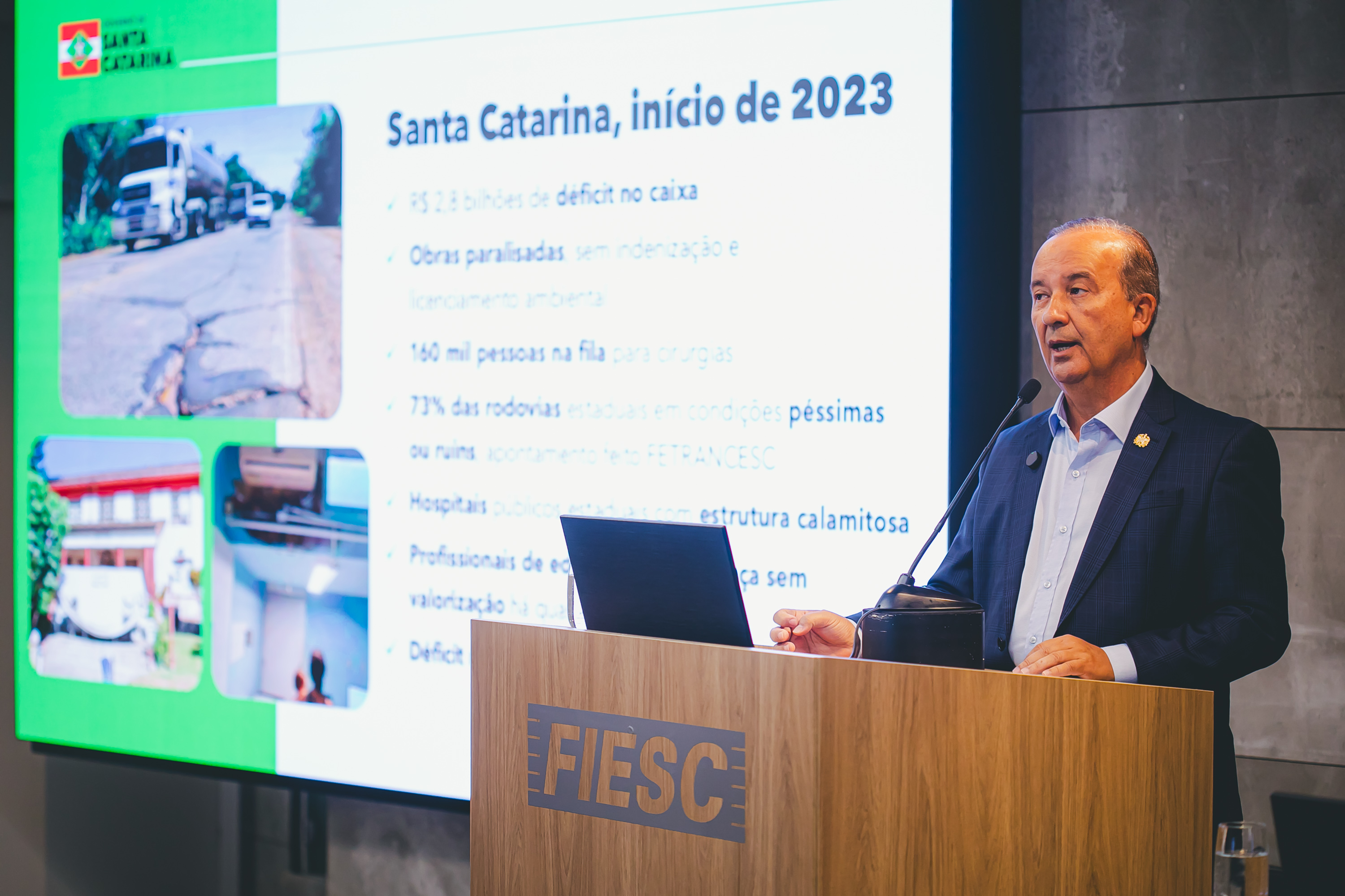 O governador destacou em sua apresentação que solicitou ao governo federal a estadualização da BR-282. “Pedimos que nos entreguem a rodovia para a gente cuidar. Senão daqui a pouco a situação estará caótica igual à BR-101”, afirmou.