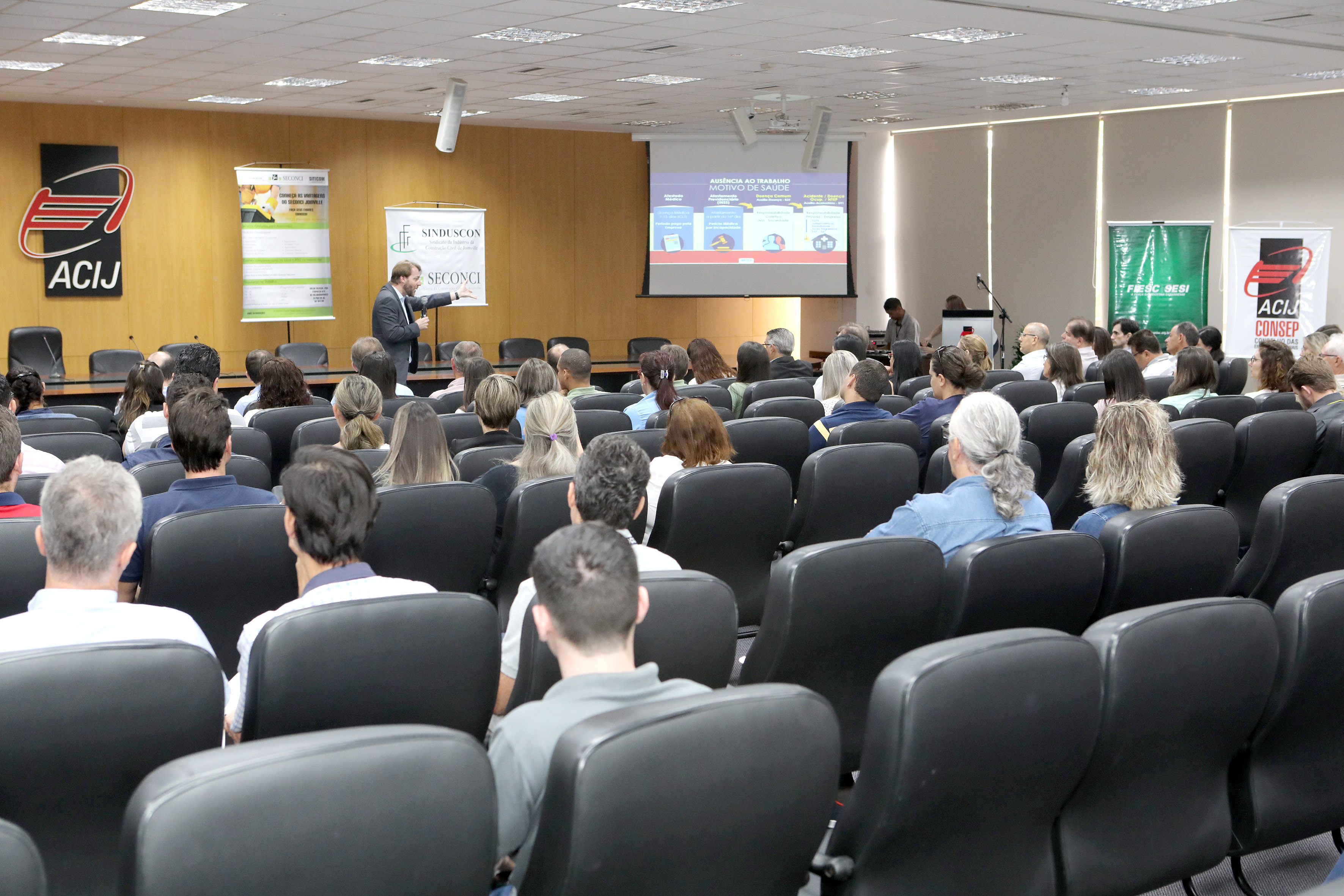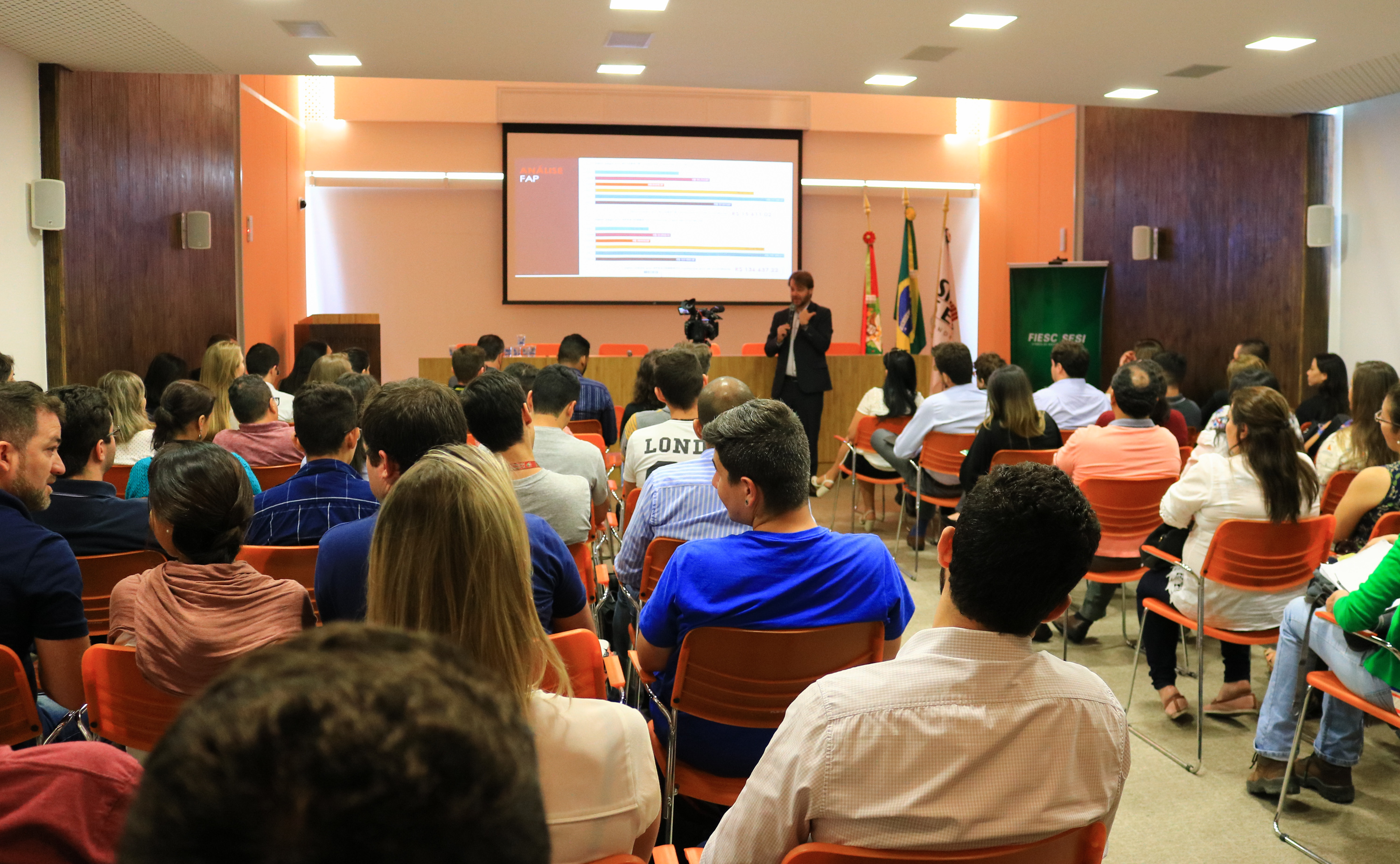 Florianópolis, 28.11.2017 – A Federação das Indústrias de Santa Catarina (FIESC), por meio do SESI, em parceria com o Sinduscon e o Serviço Social da Construção Civil (Seconci) de Joinville, Blumenau e da Grande Florianópolis, promoveu nestas segunda e terça-feiras (27 e 28) palestras sobre os impactos do eSocial e do Fator Acidentário de Prevenção (FAP) na gestão de Saúde e Segurança no Trabalho. O objetivo foi esclarecer o tema às indústrias de cada região com apresentação sobre como funciona o eSocial, as novidades e as mudanças que o sistema irá provocar.