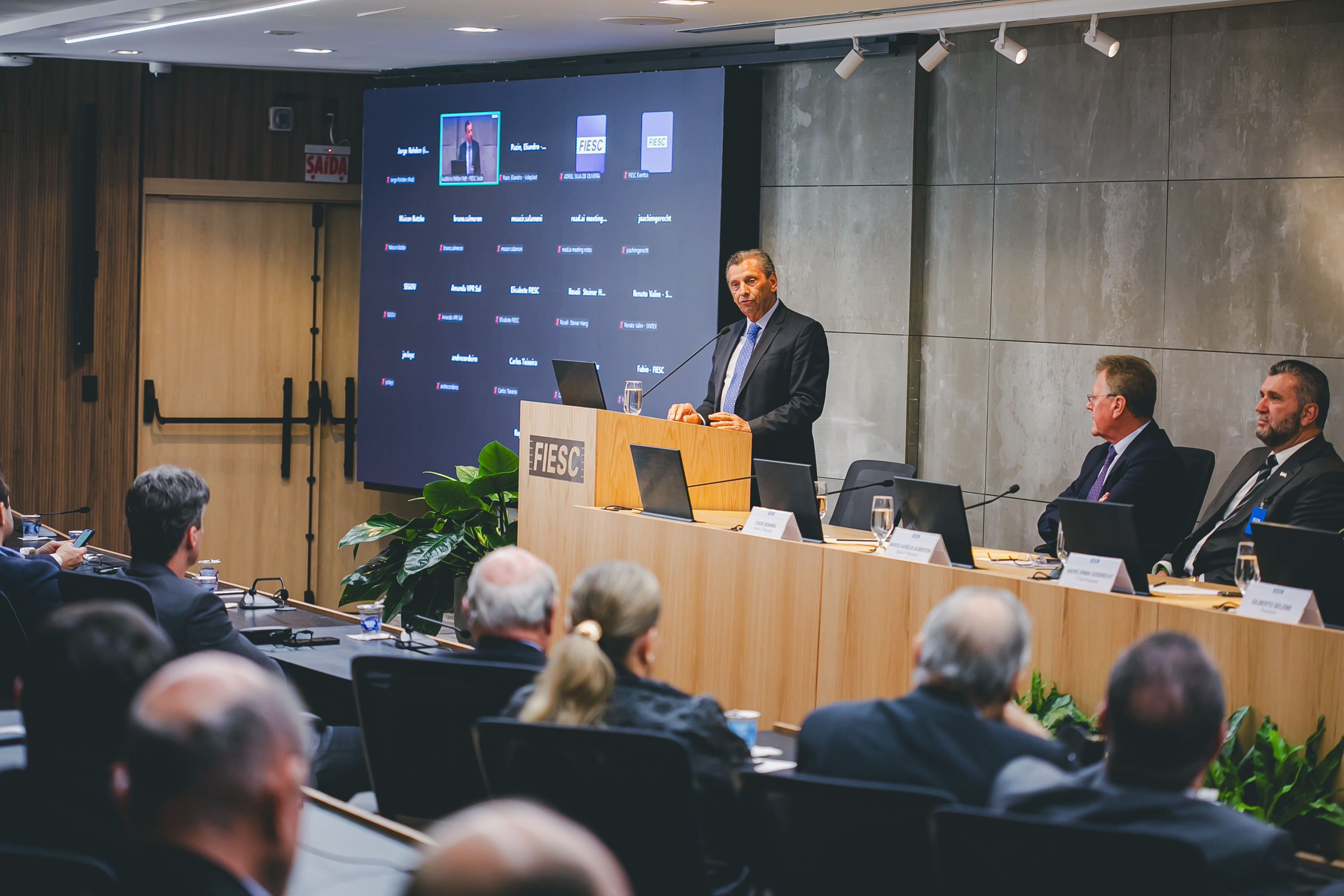 Florianópolis, 14.11.2025 – Nesta sexta-feira, dia 14, o presidente da Assembleia Legislativa (ALESC), Júlio Garcia, e o prefeito de Florianópolis, Topázio Neto, participaram da reunião de diretoria da FIESC. Eles destacaram os desafios da gestão pública que afetam a sociedade e quem produz e investe no país.