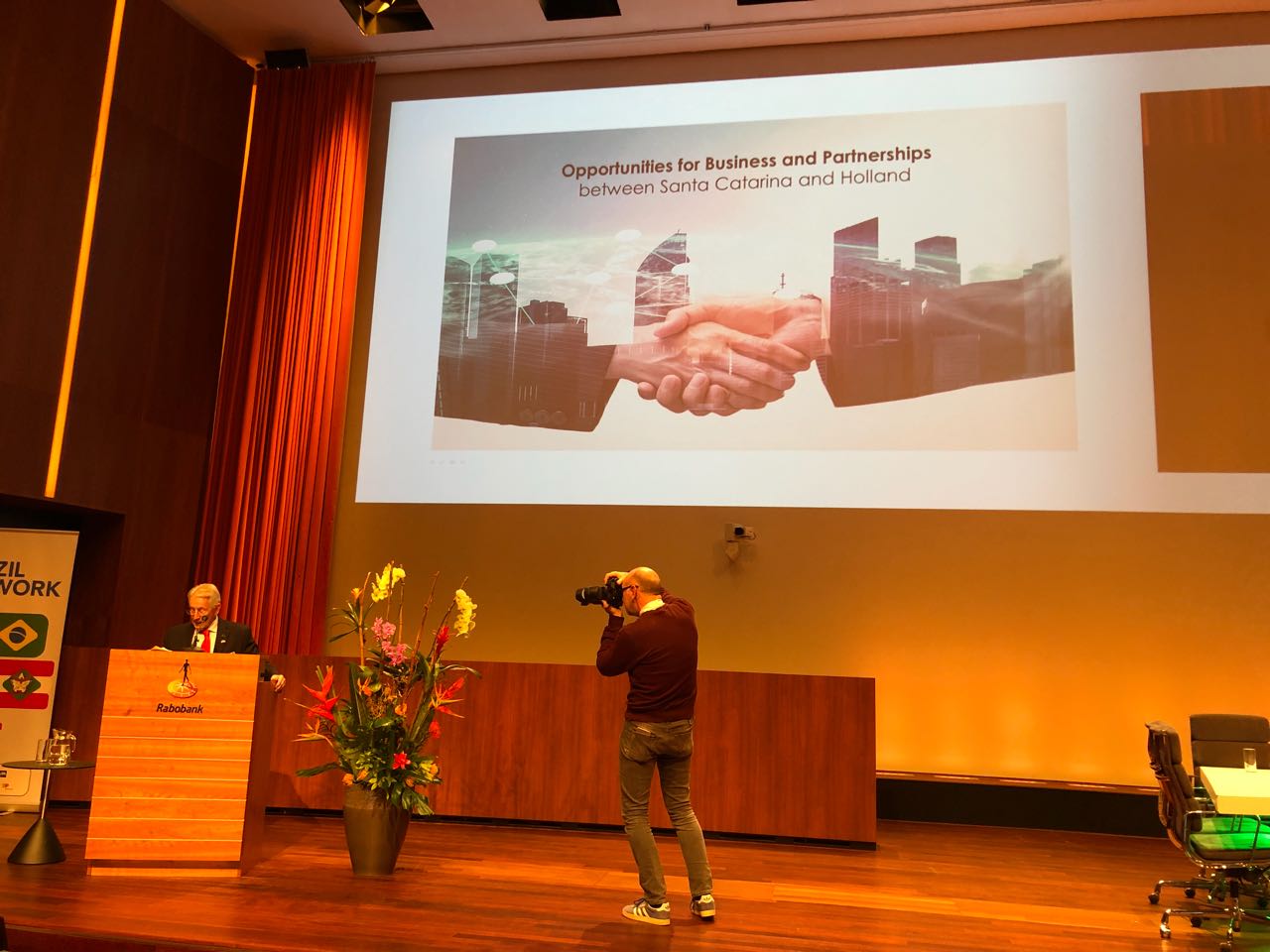 Florianópolis, 7.11.2017 – No Seminário Brazil Network Day, que reuniu mais de 300 empresários europeus em Utrecht, na Holanda, nesta terça-feira (7), o presidente da Federação das Indústrias de Santa Catarina (FIESC), Glauco José Côrte, apresentou o potencial do Estado para receber investimentos estrangeiros. “É consenso geral que Santa Catarina pode representar uma atraente alternativa de investimento em áreas relacionadas à inovação e tecnologia”, resumiu Côrte ao final do encontro. Ele está articulando com a Câmara de Comércio Holanda-Brasil a vinda de uma missão de empresários holandeses para Santa Catarina no primeiro semestre de 2018. O evento foi realizado na sede do Rabobank, banco líder global em serviços de financiamento para alimentação e o segundo maior dos Países Baixos em número de ativos. A instituição tem 13 agências no Brasil.