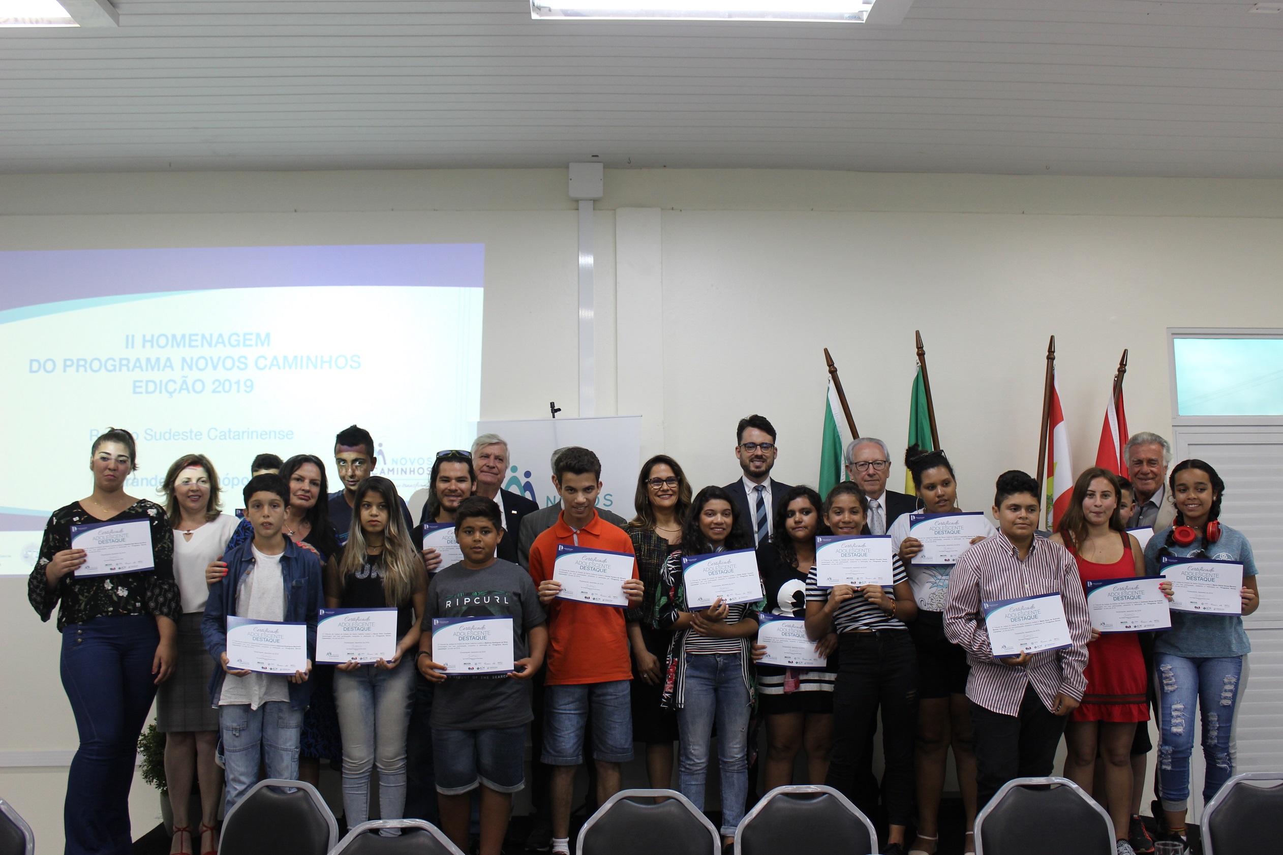 São José, 11.12.2019 – Jovens que vivem em casas de acolhimento na Grande Florianópolis e se destacaram no Programa Novos Caminhos foram homenageados nesta quarta-feira (11) em evento no SESI de São José. Os 49 alunos participam do programa de qualificação profissional que beneficia adolescentes que se encontram ou passaram por medida protetiva de acolhimento a se inserirem no mercado de trabalho. Instituições parceiras, equipes técnicas e empresas também receberam um reconhecimento pelo apoio ao projeto.