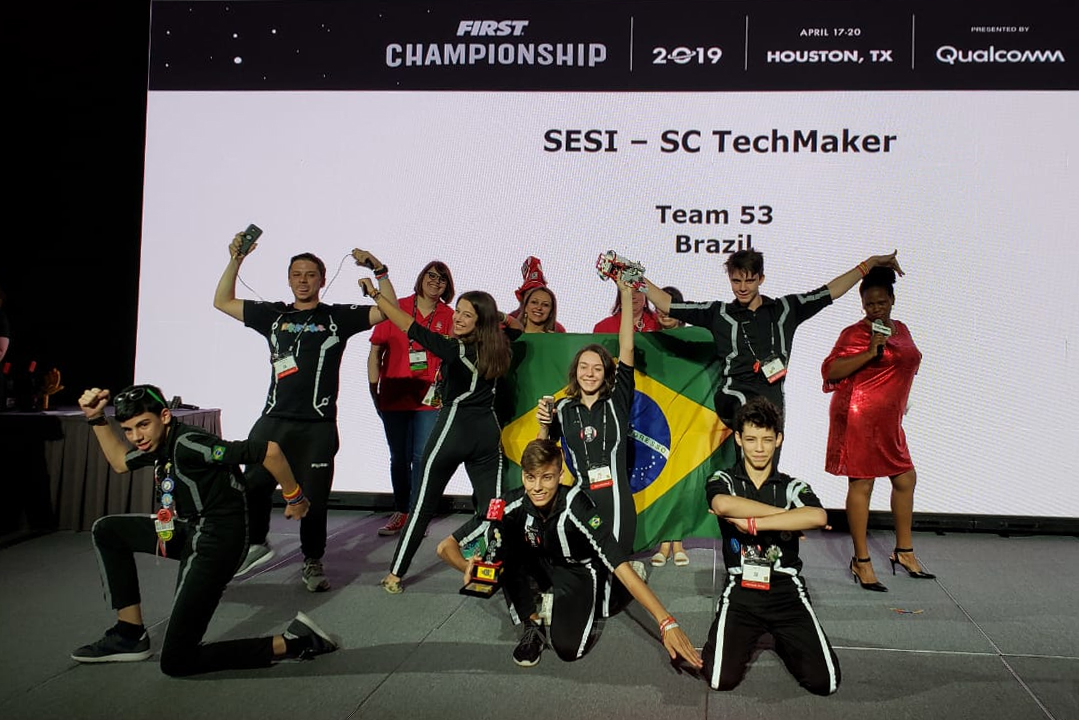 Florianópolis, 20.4.2019 – A equipe Techmaker, do SESI de Blumenau, está entre as 15 melhores na categoria Desafio do Robô e foi agraciada pelos juízes do mundial de robótica da First Championship com o primeiro lugar no troféu Gracious Professionalism. O anúncio do prêmio ocorreu neste sábado (20), no encerramento da competição que reuniu estudantes de 60 países em Houston (EUA).