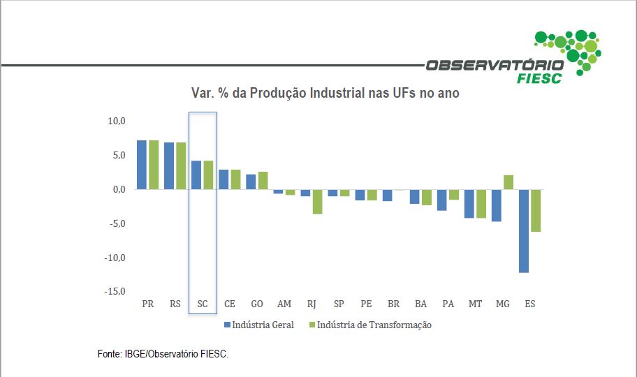 Florianópolis, 4.9.2019 – A produção industrial catarinense acumula alta de 4,2% até julho em relação ao mesmo período no ano passado, mostram os dados do IBGE, divulgados pelo Observatório FIESC. O desempenho foi puxado principalmente pelas atividades de máquinas, aparelhos e materiais elétricos (12,3%) e fabricação de produtos de metal (10,9%). É o terceiro melhor resultado do país atrás dos estados do Paraná (7,2%) e do Rio Grande do Sul (6,9%). No ano, os estados da região sul registraram o melhor desempenho do país. Veja aqui os dados dos Observatório FIESC