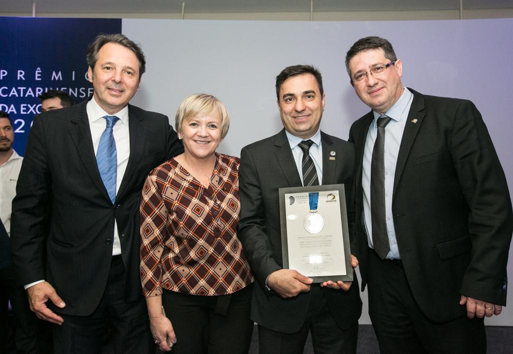 Florianópolis, 4.10.2019 – O Sindicato das Indústrias Metalúrgicas, Mecânicas e do Material Elétrico de Chapecó (SIMEC) foi reconhecido no Prêmio Catarinense da Excelência (PCE), na noite desta quinta-feira (3), em Florianópolis, pelo Movimento Catarinense pela Excelência (MCE). O sindicato é filiado à FIESC e participou do Programa de Excelência em Gestão Sindical (PEGS), desenvolvido pela Federação. Também receberam a premiação a Ogochi, de São Carlos, a Termotécnica e Schulz, ambas de Joinville.